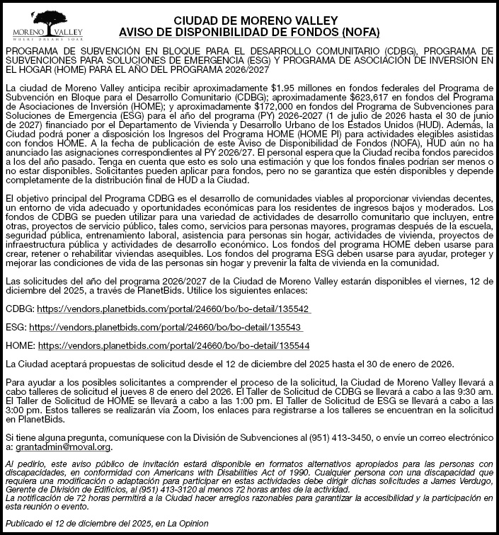 CIUDAD DE MORENO VALLEY AVISO DE DISPONIBILIDAD DE FONDOS (NOFA) PROGRAMA DE SUBVENCIÓN EN BLOQUE PARA EL DESARROLLO COMUNITARIO (CDBG), PROGRAMA DE SUBVENCIONES PARA SOLUCIONES DE EMERGENCIA (ESG) Y PROGRAMA DE ASOCIACIÓN DE INVERSIÓN EN EL HOGAR (HOME) PARA EL AÑO DEL PROGRAMA 2026/2027 La ciudad de Moreno Valley anticipa recibir aproximadamente $1.95 millones en fondos federales del Programa de Subvención en Bloque para el Desarrollo Comunitario (CDBG); aproximadamente $623,617 en fondos del Programa de Asociaciones de Inversión (HOME); y aproximadamente $172,000 en fondos del Programa de Subvenciones para Soluciones de Emergencia (ESG) para el año del programa (PY) 2026-2027 (1 de julio de 2026 hasta el 30 de junio de 2027) financiado por el Departamento de Vivienda y Desarrollo Urbano de los Estados Unidos (HUD). Además, la Ciudad podrá poner a disposición los Ingresos del Programa HOME (HOME PI) para actividades elegibles asistidas con fondos HOME. A la fecha de publicación de este Aviso de Disponibilidad de Fondos (NOFA), HUD aún no ha anunciado las asignaciones correspondientes al PY 2026/27. El personal espera que la Ciudad reciba fondos parecidos a los del año pasado. Tenga en cuenta que esto es solo una estimación y que los fondos finales podrían ser menos o no estar disponibles. Solicitantes pueden aplicar para fondos, pero no se garantiza que estén disponibles y depende completamente de la distribución final de HUD a la Ciudad. El objetivo principal del Programa CDBG es el desarrollo de comunidades viables al proporcionar viviendas decentes, un entorno de vida adecuado y oportunidades económicas para los residentes de ingresos bajos y moderados. Los fondos de CDBG se pueden utilizar para una variedad de actividades de desarrollo comunitario que incluyen, entre otras, proyectos de servicio público, tales como, servicios para personas mayores, programas después de la escuela, seguridad pública, entrenamiento laboral, asistencia para personas sin hogar, actividades de vivienda, proyectos de infraestructura pública y actividades de desarrollo económico. Los fondos del programa HOME deben usarse para crear, retener o rehabilitar viviendas asequibles. Los fondos del programa ESG deben usarse para ayudar, proteger y mejorar las condiciones de vida de las personas sin hogar y prevenir la falta de vivienda en la comunidad. Las solicitudes del año del programa 2026/2027 de la Ciudad de Moreno Valley estarán disponibles el viernes, 12 de diciembre del 2025, a través de PlanetBids. Utilice los siguientes enlaces: CDBG: https://vendors.planetbids.com/portal/24660/bo/bo-detail/135542 ESG: https://vendors.planetbids.com/portal/24660/bo/bo-detail/135543 HOME: https://vendors.planetbids.com/portal/24660/bo/bo-detail/135544 La Ciudad aceptará propuestas de solicitud desde el 12 de diciembre del 2025 hasta el 30 de enero de 2026. Para ayudar a los posibles solicitantes a comprender el proceso de la solicitud, la Ciudad de Moreno Valley llevará a cabo talleres de solicitud el jueves 8 de enero del 2026. El Taller de Solicitud de CDBG se llevará a cabo a las 9:30 am. El Taller de Solicitud de HOME se llevará a cabo a las 1:00 pm. El Taller de Solicitud de ESG se llevará a cabo a las 3:00 pm. Estos talleres se realizarán vía Zoom, los enlaces para registrarse a los talleres se encuentran en la solicitud en PlanetBids. Si tiene alguna pregunta, comuníquese con la División de Subvenciones al (951) 413-3450, o envíe un correo electrónico a: grantadmin@moval.org. Al pedirlo, este aviso público de invitación estará disponible en formatos alternativos apropiados para las personas con discapacidades, en conformidad con Americans with Disabilities Act of 1990. Cualquier persona con una discapacidad que requiera una modificación o adaptación para participar en estas actividades debe dirigir dichas solicitudes a James Verdugo, Gerente de División de Edificios, al (951) 413-3120 al menos 72 horas antes de la actividad. La notificación de 72 horas permitirá a la Ciudad hacer arreglos razonables para garantizar la accesibilidad y la participación en esta reunión o evento. Publicado el 12 de diciembre del 2025, en La Opinion