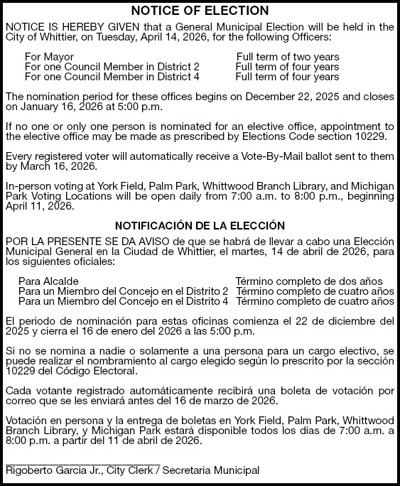 NOTICE OF ELECTION NOTICE IS HEREBY GIVEN that a General Municipal Election will be held in the City of Whittier, on Tuesday, April 14, 2026, for the following Officers: For Mayor Full term of two years For one Council Member in District 2 Full term of four years For one Council Member in District 4 Full term of four years The nomination period for these offices begins on December 22, 2025 and closes on January 16, 2026 at 5:00 p.m. If no one or only one person is nominated for an elective office, appointment to the elective office may be made as prescribed by Elections Code section 10229. Every registered voter will automatically receive a Vote-By-Mail ballot sent to them by March 16, 2026. In-person voting at York Field, Palm Park, Whittwood Branch Library, and Michigan Park Voting Locations will be open daily from 7:00 a.m. to 8:00 p.m., beginning April 11, 2026. NOTIFICACIÓN DE LA ELECCIÓN POR LA PRESENTE SE DA AVISO de que se habrá de llevar a cabo una Elección Municipal General en la Ciudad de Whittier, el martes, 14 de abril de 2026, para los siguientes oficiales: Para Alcalde Término completo de dos años Para un Miembro del Concejo en el Distrito 2 Término completo de cuatro años Para un Miembro del Concejo en el Distrito 4 Término completo de cuatro años El periodo de nominación para estas oficinas comienza el 22 de diciembre del 2025 y cierra el 16 de enero del 2026 a las 5:00 p.m. Si no se nomina a nadie o solamente a una persona para un cargo electivo, se puede realizar el nombramiento al cargo elegido según lo prescrito por la sección 10229 del Código Electoral. Cada votante registrado automáticamente recibirá una boleta de votación por correo que se les enviará antes del 16 de marzo de 2026. Votación en persona y la entrega de boletas en York Field, Palm Park, Whittwood Branch Library, y Michigan Park estará disponible todos los días de 7:00 a.m. a 8:00 p.m. a partir del 11 de abril de 2026. Rigoberto Garcia Jr., City Clerk / Secretaria Municipal
