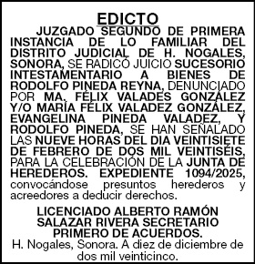 EDICTO JUZGADO SEGUNDO DE PRIMERA INSTANCIA DE LO FAMILIAR DEL DISTRITO JUDICIAL DE H. NOGALES, SONORA, SE RADICÓ JUICIO SUCESORIO INTESTAMENTARIO A BIENES DE RODOLFO PINEDA REYNA, DENUNCIADO POR MA. FÉLIX VALADES GONZÁLEZ Y/O MARÍA FÉLIX VALADEZ GONZÁLEZ, EVANGELINA PINEDA VALADEZ, Y RODOLFO PINEDA, SE HAN SEÑALADO LAS NUEVE HORAS DEL DIA VEINTISIETE DE FEBRERO DE DOS MIL VEINTISÉIS, PARA LA CELEBRACIÓN DE LA JUNTA DE HEREDEROS. EXPEDIENTE 1094/2025, convocándose presuntos herederos y acreedores a deducir derechos. LICENCIADO ALBERTO RAMÓN SALAZAR RIVERA SECRETARIO PRIMERO DE ACUERDOS. H. Nogales, Sonora. A diez de diciembre de dos mil veinticinco.