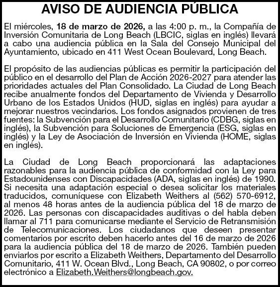 AVISO DE AUDIENCIA PÚBLICA El miércoles, 18 de marzo de 2026, a las 4:00 p. m., la Compañía de Inversión Comunitaria de Long Beach (LBCIC, siglas en inglés) llevará a cabo una audiencia pública en la Sala del Consejo Municipal del Ayuntamiento, ubicado en 411 West Ocean Boulevard, Long Beach. El propósito de las audiencias públicas es permitir la participación del público en el desarrollo del Plan de Acción 2026-2027 para atender las prioridades actuales del Plan Consolidado. La Ciudad de Long Beach recibe anualmente fondos del Departamento de Vivienda y Desarrollo Urbano de los Estados Unidos (HUD, siglas en inglés) para ayudar a mejorar nuestros vecindarios. Los fondos asignados provienen de tres fuentes: la Subvención para el Desarrollo Comunitario (CDBG, siglas en inglés), la Subvención para Soluciones de Emergencia (ESG, siglas en inglés) y la Ley de Asociación de Inversión en Vivienda (HOME, siglas en inglés). La Ciudad de Long Beach proporcionará las adaptaciones razonables para la audiencia pública de conformidad con la Ley para Estadounidenses con Discapacidades (ADA, siglas en inglés) de 1990. Si necesita una adaptación especial o desea solicitar los materiales traducidos, comuníquese con Elizabeth Weithers al (562) 570-6912, al menos 48 horas antes de la audiencia pública del 18 de marzo de 2026. Las personas con discapacidades auditivas o del habla deben llamar al 711 para comunicarse mediante el Servicio de Retransmisión de Telecomunicaciones. Los ciudadanos que deseen presentar comentarios por escrito deben hacerlo antes del 16 de marzo de 2026 para la audiencia pública del 18 de marzo de 2026. También pueden enviarlos por escrito a Elizabeth Weithers, Departamento del Desarrollo Comunitario, 411 W. Ocean Blvd., Long Beach, CA 90802, o por correo electrónico a Elizabeth.Weithers@longbeach.gov.