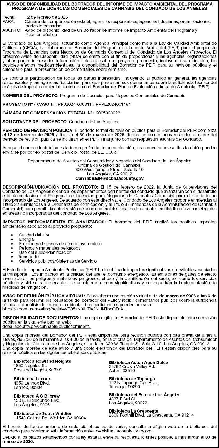 AVISO DE DISPONIBILIDAD DEL BORRADOR DEL INFORME DE IMPACTO AMBIENTAL DEL PROGRAMA PROGRAMA DE LICENCIAS COMERCIALES DE CANNABIS DEL CONDADO DE LOS ÁNGELES Fecha: 12 de febrero de 2026 PARA: Cámara de compensación estatal, agencias responsables, agencias fiduciarias, organizaciones, partes interesadas ASUNTO: Aviso de disponibilidad de un Borrador de Informe de Impacto Ambiental del Programa y Reunión pública El Condado de Los Ángeles, actuando como Agencia Principal conforme a la Ley de Calidad Ambiental de California (CEQA), ha elaborado un Borrador del Programa de Impacto Ambiental (PEIR) para el propuesto Programa de Licencias para Negocios de Cannabis Comercial del Condado de Los Ángeles (Proyecto). El presente Aviso de Disponibilidad (NOA) se emite con el fin de proporcionar a las agencias, organizaciones y otras partes interesadas información detallada sobre el proyecto propuesto, incluyendo su ubicación, los posibles efectos medioambientales, la disponibilidad del Borrador de PEIR para su revisión pública y el calendario para la presentación de comentarios sobre el mismo. Se solicita la participación de todas las partes interesadas, incluyendo al público en general, las agencias responsables y las agencias fiduciarias, para que presenten sus comentarios sobre la suficiencia técnica del análisis de impacto ambiental contenido en el Borrador del Plan de Evaluación e Impacto Ambiental (PEIR). NOMBRE DEL PROYECTO: Programa de Licencias para Negocios Comerciales de Cannabis PROYECTO Nº / CASO Nº: PRJ2024-000811 / RPPL2024001191 CÁMARA DE COMPENSACIÓN ESTATAL Nº: 2025030223 SOLICITANTE DEL PROYECTO: Condado de Los Ángeles PERIODO DE REVISIÓN PÚBLICA: El periodo formal de revisión pública para el Borrador del PEIR comienza el 12 de febrero de 2026 y finaliza el 30 de marzo de 2026. Todos los comentarios recibidos al cierre del periodo de revisión pública se incluirán en el PEIR Final junto con las respuestas escritas del Condado. Aunque el correo electrónico es la forma preferida de comunicación, los comentarios escritos también pueden enviarse por correo postal del Servicio Postal de EE. UU. a: Departamento de Asuntos del Consumidor y Negocios del Condado de Los Ángeles Oficina de Gestión del Cannabis 320 West Temple Street, Sala G-10 Los Ángeles, CA 90012 CannabisEIR@dcba.lacounty.gov DESCRIPCIÓN/UBICACIÓN DEL PROYECTO: El 15 de febrero de 2022, la Junta de Supervisores del Condado de Los Ángeles ordenó a los departamentos pertinentes del condado que avanzaran con el desarrollo e implementación del Programa de Licencias para Negocios de Cannabis Comercial para el condado no incorporado de Los Ángeles. De acuerdo con esta directiva, el Condado de Los Ángeles propone enmiendas al Título 22 (Enmiendas a la Ordenanza de Zonificación) y al Título 8 (Enmiendas de la Administración de Cannabis Comercial) para permitir la autorización de usos comerciales legales de cannabis en distritos de zonas elegibles en áreas no incorporadas del condado de Los Ángeles. IMPACTOS MEDIOAMBIENTALES ANALIZADOS: El borrador del PEIR analizó los posibles impactos ambientales asociados al proyecto propuesto: — Calidad del aire — Energía — Emisiones de gases de efecto invernadero — Peligros y materiales peligrosos — Uso del suelo/Planificación — Transporte — Servicios públicos/Sistemas de Servicio El Estudio de Impacto Ambiental Preliminar (PEIR) ha identificado impactos significativos e inevitables asociados al transporte. Los impactos en la calidad del aire, el consumo energético, las emisiones de gases de efecto invernadero, los peligros y materiales peligrosos, el uso y la planificación del suelo, así como los servicios públicos y sistemas de servicios, se consideran menos significativos y no requerirán la implementación de medidas de mitigación. AVISO DE REUNIÓN PÚBLICA VIRTUAL: Se celebrará una reunión virtual el 11 de marzo de 2026 a las 6 de la tarde para resumir los resultados del borrador del PEIR y recibir comentarios públicos sobre la suficiencia técnica del análisis de impacto ambiental. Los participantes pueden unirse a https://zoom.us/meeting/register/B05zNiXHTle2NUNTncOTnA. DISPONIBILIDAD DE DOCUMENTOS: Una copia digital del Borrador del PEIR está disponible para su revisión pública en la siguiente página web: dcba.lacounty.gov/cannabis/publiccomment. Una copia impresa del Borrador del PEIR está disponible para revisión pública con cita previa de lunes a jueves, de 8:30 de la mañana a las 4:30 de la tarde, en la oficina del Departamento de Asuntos del Consumidor y Negocios del Condado de Los Ángeles, situada en 320 W. Temple St. Sala G-10, Los Ángeles, CA 90012. Una copia impresa de este aviso y una copia electrónica del Borrador del PEIR están disponibles para su revisión pública en las siguientes bibliotecas públicas: Biblioteca Rowland Heights 1850 Nogales St. Rowland Heights, 91748 Biblioteca Lennox 4359 Lennox Blvd. Lennox, 90304 Biblioteca A C Bilbrew 150 E. El Segundo Blvd. Los Ángeles, 90061 Biblioteca de South Whittier 11543 Colima Rd. Whittier, CA 90604 El horario de funcionamiento de cada biblioteca puede variar; consulte la página web de la biblioteca del condado para confirmar esta información antes de visitar: lacountylibrary.org. Debido a los plazos establecidos por la ley estatal, envíe su respuesta lo antes posible, a más tardar el 30 de marzo de 2026. Biblioteca Acton Agua Dulce 33792 Crown Valley Rd. Acton, 93510 Biblioteca de Topanga 122 N Topanga Cyn Blvd. Topanga, 90290 Biblioteca del Este de Los Ángeles 4837 E 3rd St. Los Ángeles, 90022 Biblioteca La Crescenta 2809 Foothill Blvd. La Crescenta, CA 91214