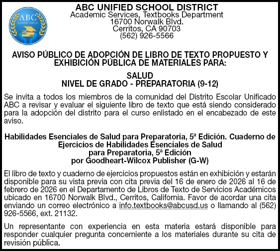 ABC UNIFIED SCHOOL DISTRICT Academic Services, Textbooks Department 16700 Norwalk Blvd. Cerritos, CA 90703 (562) 926-5566 AVISO PÚBLICO DE ADOPCIÓN DE LIBRO DE TEXTO PROPUESTO Y EXHIBICIÓN PÚBLICA DE MATERIALES PARA: SALUD NIVEL DE GRADO – PREPARATORIA (9-12) Se invita a todos los miembros de la comunidad del Distrito Escolar Unificado ABC a revisar y evaluar el siguiente libro de texto que está siendo considerado para la adopción del distrito para el curso enlistado en el encabezado de este aviso. Habilidades Esenciales de Salud para Preparatoria, 5ª Edición. Cuaderno de Ejercicios de Habilidades Esenciales de Salud para Preparatoria, 5ª Edición por Goodheart-Wilcox Publisher (G-W) El libro de texto y cuaderno de ejercicios propuestos están en exhibición y estarán disponible para su vista previa con cita previa del 16 de enero de 2026 al 16 de febrero de 2026 en el Departamento de Libros de Texto de Servicios Académicos ubicado en 16700 Norwalk Blvd., Cerritos, California. Favor de acordar una cita enviando un correo electrónico a info.textbooks@abcusd.us o llamando al (562) 926-5566, ext. 21132. Un representante con experiencia en esta materia estará disponible para responder cualquier pregunta concerniente a los materiales durante su cita de revisión pública.
