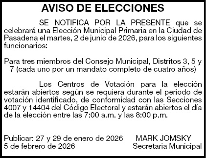 AVISO DE ELECCIONES SE NOTIFICA POR LA PRESENTE que se celebrará una Elección Municipal Primaria en la Ciudad de Pasadena el martes, 2 de junio de 2026, para los siguientes funcionarios: Para tres miembros del Consejo Municipal, Distritos 3, 5 y 7 (cada uno por un mandato completo de cuatro años) Los Centros de Votación para la elección estarán abiertos según se requiera durante el período de votación identificado, de conformidad con las Secciones 4007 y 14404 del Código Electoral y estarán abiertos el día de la elección entre las 7:00 a.m. y las 8:00 p.m. Publicar: 27 y 29 de enero de 2026 MARK JOMSKY 5 de febrero de 2026 Secretaria Municipal