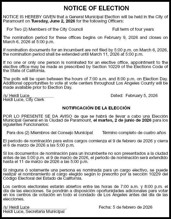NOTICE OF ELECTION NOTICE IS HEREBY GIVEN that a General Municipal Election will be held in the City of Paramount on Tuesday, June 2, 2026 for the following Officers: For Two (2) Members of the City Council Full term of four years The nomination period for these offices begins on February 9, 2026 and closes on March 6, 2026 at 5:00 p.m. If nomination documents for an incumbent are not filed by 5:00 p.m. on March 6, 2026, the nomination period shall be extended until March 11, 2026 at 5:00 p.m. If no one or only one person is nominated for an elective office, appointment to the elective office may be made as prescribed by Section 10229 of the Elections Code of the State of California. The polls will be open between the hours of 7:00 a.m. and 8:00 p.m. on Election Day. Additional opportunities to vote at vote centers throughout Los Angeles County will be made available prior to Election Day. /s/ Heidi Luce Dated: February 5, 2026 Heidi Luce, City Clerk NOTIFICACIÓN DE LA ELECCIÓN POR LO PRESENTE SE DA AVISO de que se habrá de llevar a cabo una Elección Municipal General en la Ciudad de Paramount, el martes, 2 de junio de 2026 para los siguientes Funcionarios: Para dos (2) Miembros del Consejo Municipal Término completo de cuatro años El periodo de nominación para estos cargos comienza el 9 de febrero de 2026 y cierra el 6 de marzo de 2026 a las 5:00 p.m. Si los documentos de nominación para un incumbente no son presentados a la ciudad antes de las 5:00 p.m. el 9 de marzo de 2026, el periodo de nominación será extendido hasta el 11 de marzo de 2026 a las 5:00 p.m. Si ninguna ó solamente una persona es nominada para un cargo electivo, se puede realizar el nombramiento al cargo elegido según lo prescrito por la sección 10229 del Código Electoral del Estado de California. Los centros electorales estarán abiertos entre las horas de 7:00 a.m. y 8:00 p.m. el día de las elecciones. Se pondrán a disposición oportunidades adicionales para votar en los centros de votación en todo el condado de Los Ángeles antes del día de las elecciones. /s/ Heidi Luce Fecha: 5 de febrero de 2026 Heidi Luce, Secretaria Municipal