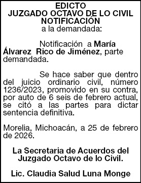 EDICTO JUZGADO OCTAVO DE LO CIVIL NOTIFICACIÓN a la demandada: Notificación a María Álvarez Rico de Jiménez, parte demandada. Se hace saber que dentro del juicio ordinario civil, número 1236/2023, promovido en su contra, por auto de 6 seis de febrero actual, se citó a las partes para dictar sentencia definitiva. Morelia, Michoacán, a 25 de febrero de 2026. La Secretaria de Acuerdos del Juzgado Octavo de lo Civil. Lic. Claudia Salud Luna Monge