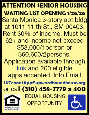 ATTENTION SENIOR HOUSING WAITING LIST OPENING 1/26/26 Santa Monica 3-story apt bldg at 1011 11 th St., SM 90403. Rent 30% of income. Must be 62+ and income not exceed $53,000/1person or $60,600/2persons. Application available through link and 200 eligible apps accepted. Info Email SVTenantApp@upwardboundhouse.org or call (310) 458-7779 x 400 EQUAL HOUSING OPPORTUNITY