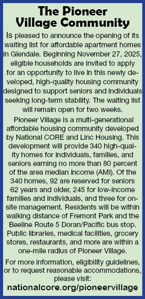 The Pioneer Village Community Is pleased to announce the opening of its waiting list for affordable apartment homes in Glendale. Beginning November 27, 2025, eligible households are invited to apply for an opportunity to live in this newly developed, high-quality housing community designed to support seniors and individuals seeking long-term stability. The waiting list will remain open for two weeks. Pioneer Village is a multi-generational affordable housing community developed by National CORE and Linc Housing. This development will provide 340 high-quality homes for individuals, families, and seniors earning no more than 80 percent of the area median income (AMI). Of the 340 homes, 92 are reserved for seniors 62 years and older, 245 for low-income families and individuals, and three for onsite management. Residents will be within walking distance of Fremont Park and the Beeline Route 5 Doran/Pacific bus stop. Public libraries, medical facilities, grocery stores, restaurants, and more are within a one-mile radius of Pioneer Village. For more information, eligibility guidelines, or to request reasonable accommodations, please visit: nationalcore.org/pioneervillage