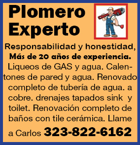 Plomero Experto Responsabilidad y honestidad, Más de 20 años de experiencia. Liqueos de GAS y agua. Calentones de pared y agua. Renovado completo de tubería de agua. a cobre. drenajes tapados sink y toilet. Renovación completo de baños con tile cerámica. Llame a Carlos 323-822-6162